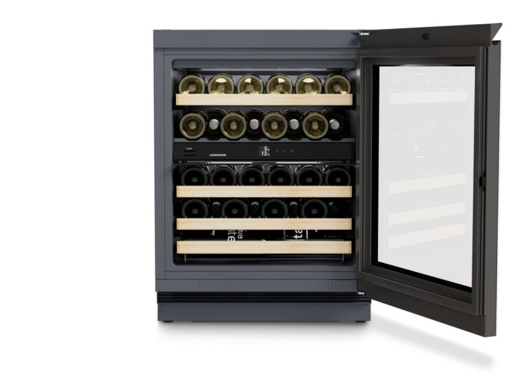 Einbau Weintemperierschrank mit TempProtect Plus, HumiditySelect, UVProtect, VibrateSafe, Touch-Display, BlackSteel Rückwand, FreshAir-Aktivkohlefilter, Metallbord mit Holzfront, Vibrationsarme Lagerung, Wechselbarer Türanschlag, 2 Zonen, Verstellbare Stellfüße, Displaysperre, Türalarm , GlassBlack mit horizontaler Griffmulde